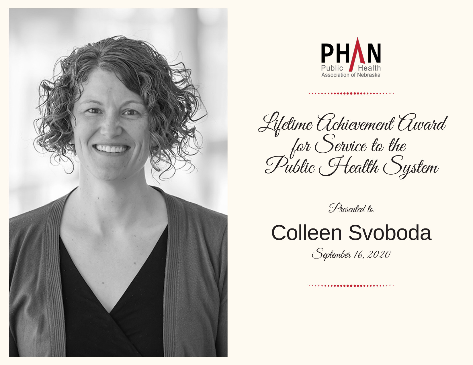 On September 16, 2020, at the Nebraska Public Health Conference, PHAN honored Colleen Svoboda with a Lifetime Achievement award in recognition for “her impact on our public health system” and her commitment to social justice to ensure health equity in the community.