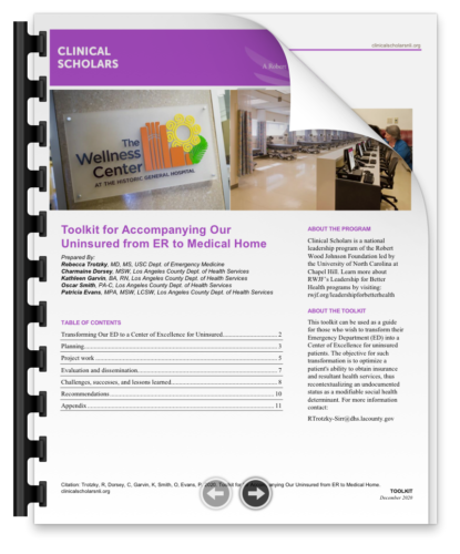 This toolkit can be used as a guide for those who wish to transform their Emergency Department (ED) into a Center of Excellence for uninsured patients. The objective for such transformation is to optimize a patient’s ability to obtain insurance and resultant health services, thus recontextualizing an undocumented status as a modifiable social health determinant.